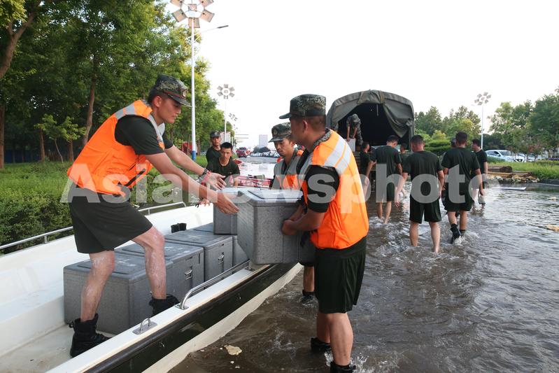 图片说明:7月24日,联勤保障部队的战士为驻守堤坝的武警送晚饭。
