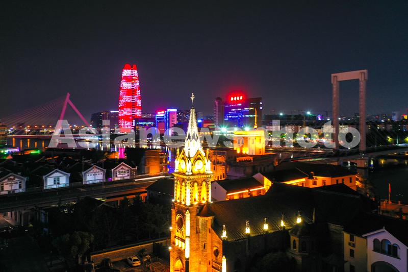 2021年7月29日,航拍浙江省宁波市三江口江北和鄞州区域高楼亮灯。