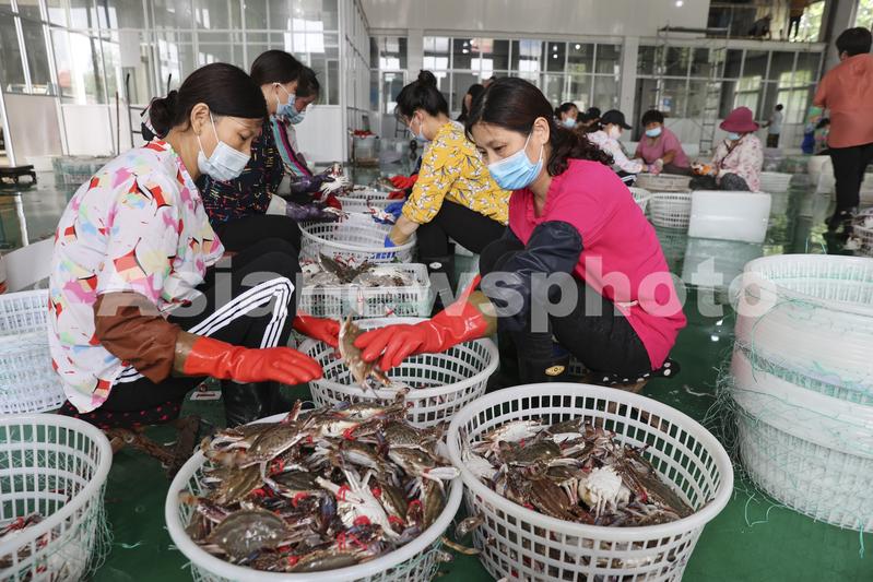 图片说明:2021年8月2日,在江苏连云港市赣榆海头港海产品交易市场,渔民们在分拣鲜活梭子蟹。