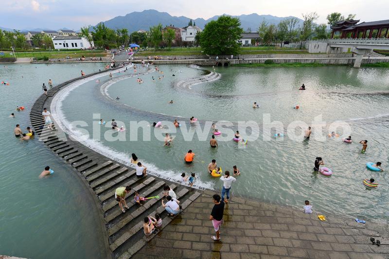 8月2日,浙江省金华市婺城区安地镇岩头村,家长带着孩子在综合治理后焕然一新的梅溪堰坝景观廊道的溪流中嬉戏玩耍,乐享清凉。