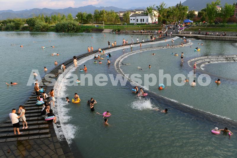 8月2日,浙江省金华市婺城区安地镇岩头村,家长带着孩子在综合治理后焕然一新的梅溪堰坝景观廊道的溪流中嬉戏玩耍,乐享清凉。