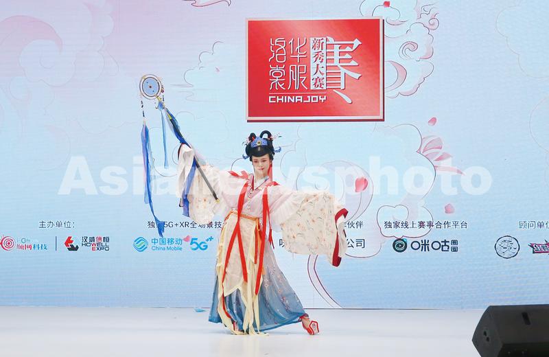 2021年7月30日,上海,ChinaJoy洛裳华服新秀大赛上汉服模特T台走秀,再现中华民族传统服饰(华服)和礼仪文化的时尚魅力。近年来中国符号、古风国风元素在文娱产业引起新的“国潮风韵”,也让热衷动漫游戏的二次元粉丝不再仅仅对洋装COSPLAY痴迷。