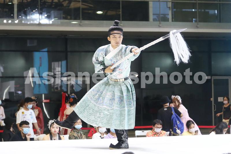 2021年7月30日,上海,汉服模特在ChinaJoy特设的T台走秀,古装少年甩花枪。