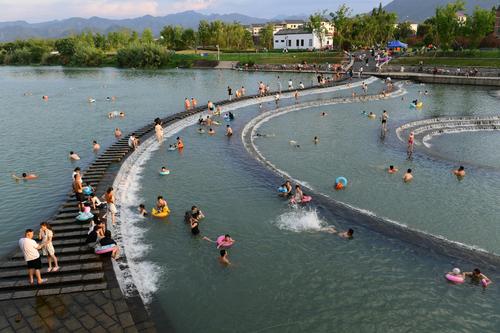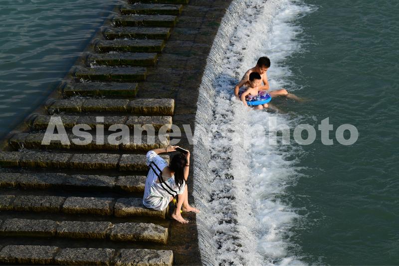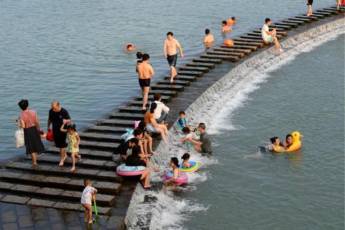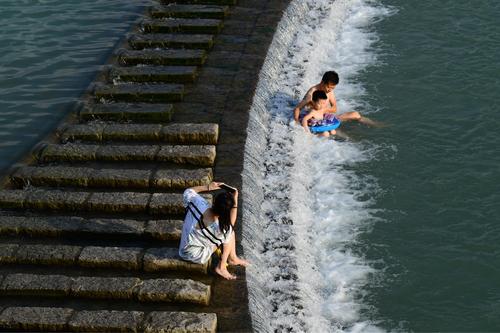 8月2日,浙江省金华市婺城区安地镇岩头村,家长带着孩子在综合治理后焕然一新的梅溪堰坝景观廊道的溪流中嬉戏玩耍,乐享清凉。