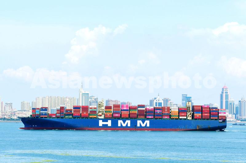 2021年8月7日,山东青岛胶州湾,一艘外贸集装箱货轮在航道上行驶。