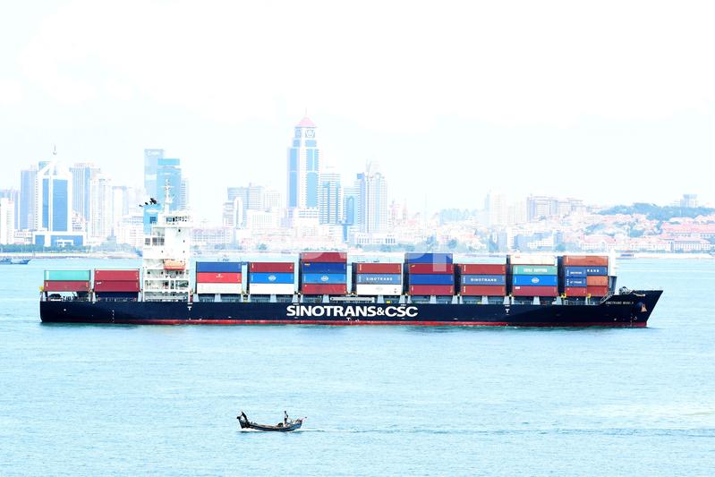 2021年8月7日,山东青岛胶州湾,一艘外贸集装箱货轮在航道上行驶。