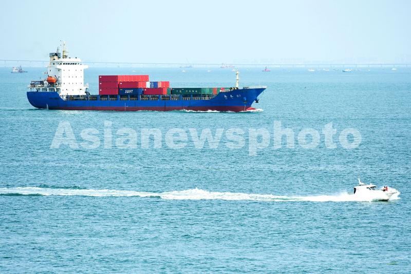 2021年8月7日,山东青岛胶州湾,内贸集装箱货轮在航道上行驶。