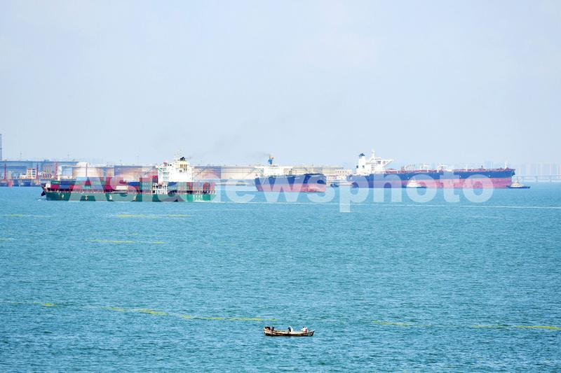 2021年8月7日,山东港口青岛港,外贸集装箱货轮和进口原油油轮在进出港口航道。