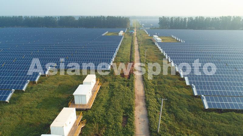 图片说明:2021年8月8日,江苏省连云港市东海县黄川镇新沭河滩涂农光互补“一地两用”的画面。
