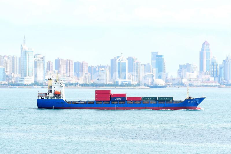 2021年8月7日,山东青岛胶州湾,内贸集装箱货轮在航道上行驶。