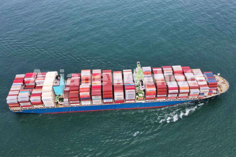 2021年8月7日,山东青岛胶州湾,一艘外贸集装箱货轮在航道上行驶。