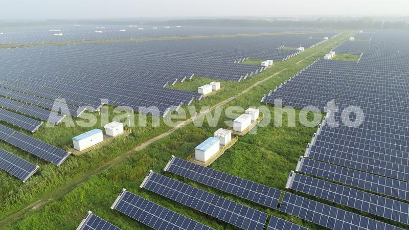 图片说明:2021年8月8日,江苏省连云港市东海县黄川镇新沭河滩涂农光互补“一地两用”的画面。