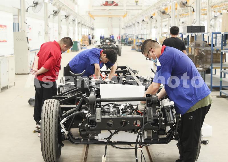 图片说明:2021年8月10日,江苏淮安,工人组装电动汽车。