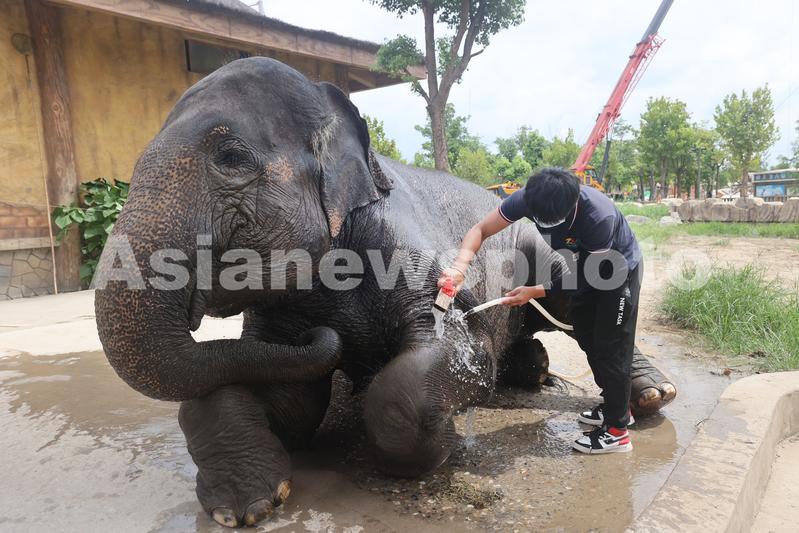 2021年8月12日,在江苏南通市,南通森林野生动物园的饲养员为亚洲象洗澡。