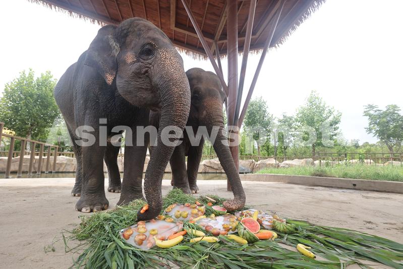 2021年8月12日,在江苏南通市,当天是“世界大象日”,南通森林野生动物园为园内的大象准备了丰盛的水果冰蛋糕,并为它们修脚美甲,去除多余的脚趾和老皮,保障其脚部健康。
