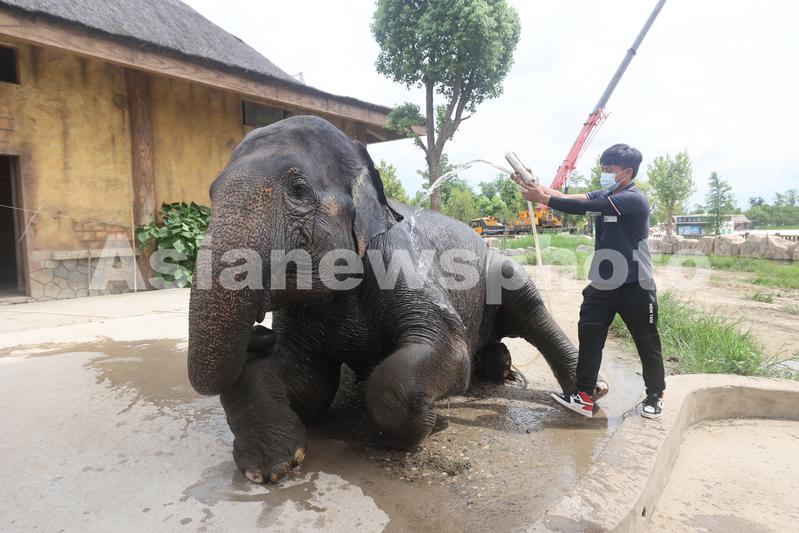 2021年8月12日,在江苏南通市,南通森林野生动物园的饲养员为亚洲象洗澡。