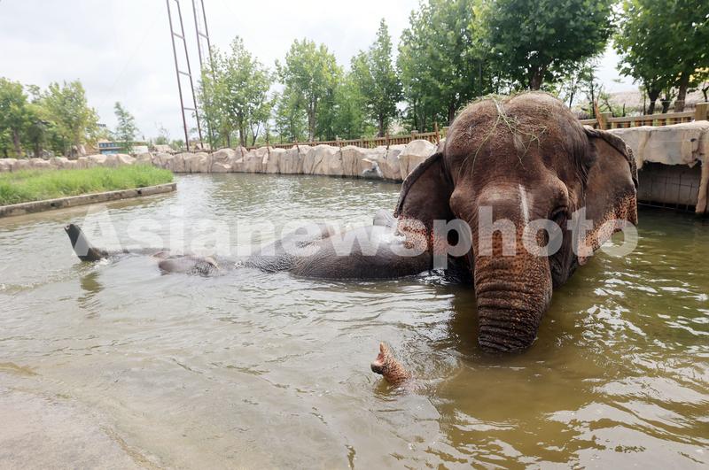 2021年8月12日,在江苏南通市,南通森林野生动物园的亚洲象在戏水。