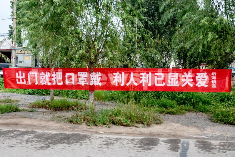 2021年8月8日,河南省新乡卫辉市后河镇路边的疫情防控标语。