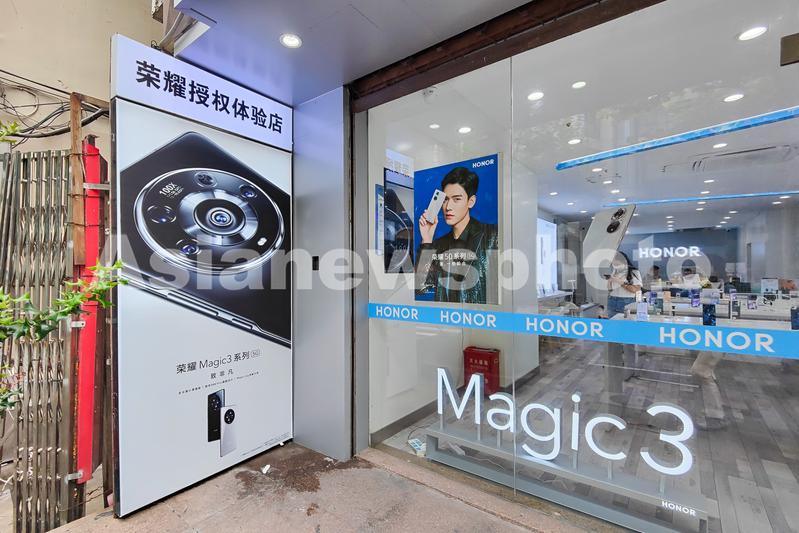 2021年8月16日,上海福州路荣耀体验店内的荣耀Magic 3手机海报。