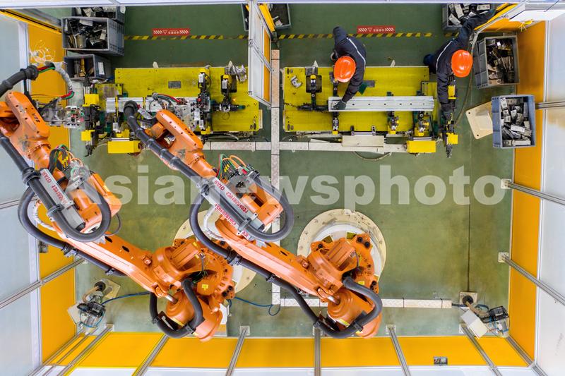 2021年8月17日,位于浙江省湖州市长兴经济技术开发区的长兴晟博汽车部件有限公司数字车间,全自动机器人正在高速运转,赶制吉利汽车的白车身前机舱订单产品。