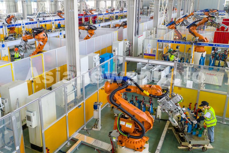 2021年8月17日,位于浙江省湖州市长兴经济技术开发区的长兴晟博汽车部件有限公司数字车间,全自动机器人正在高速运转,赶制吉利汽车的白车身前机舱订单产品。