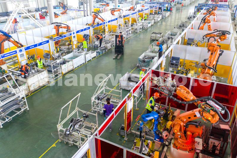 2021年8月17日,位于浙江省湖州市长兴经济技术开发区的长兴晟博汽车部件有限公司数字车间,全自动机器人正在高速运转,赶制吉利汽车的白车身前机舱订单产品。