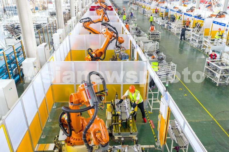 2021年8月17日,位于浙江省湖州市长兴经济技术开发区的长兴晟博汽车部件有限公司数字车间,全自动机器人正在高速运转,赶制吉利汽车的白车身前机舱订单产品。