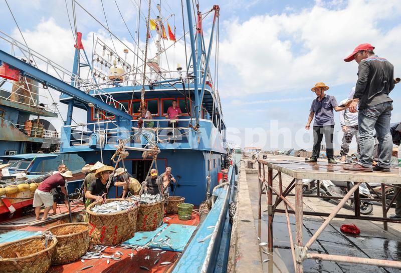 图片说明:2021年8月21日,福建晋江深沪国家中心渔港码头,出海的渔船满载而归,渔民们忙着卸鱼。