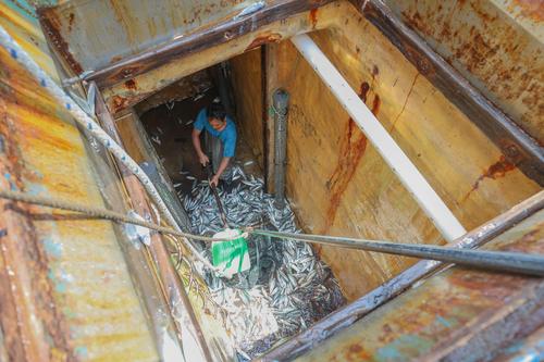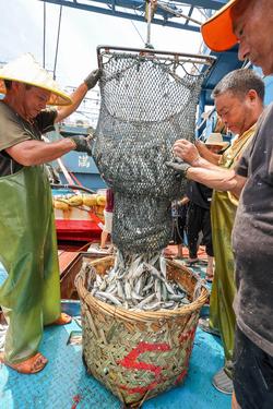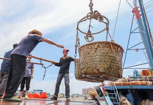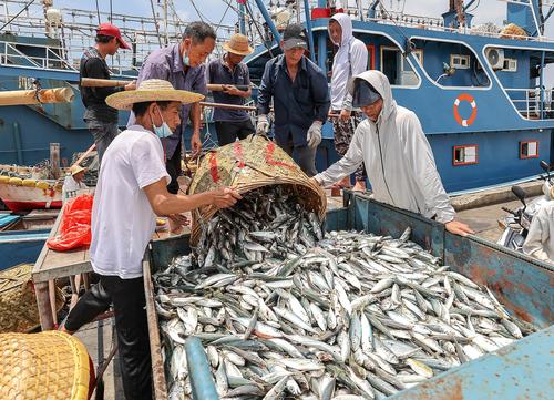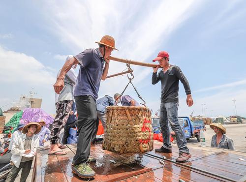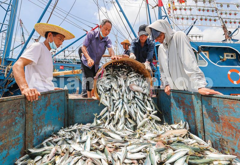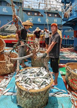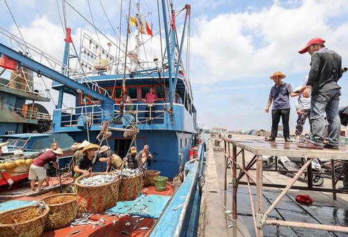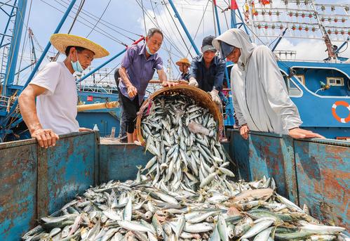 图片说明:2021年8月21日,福建晋江深沪国家中心渔港码头,出海的渔船满载而归,渔民们忙着卸鱼。