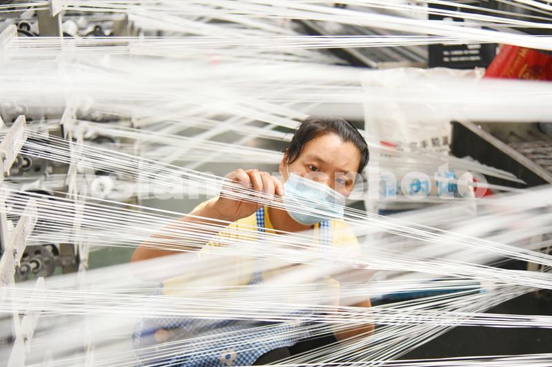 图片说明:2021年8月24日,连云港经济技术开发区一家包装公司生产车间,工人正在查看塑料编织袋加工设备运行情况。