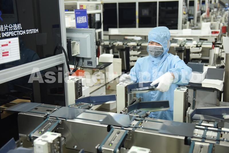 2021年8月25日,江苏省连云港市东海县晶海洋公司员工在车间生产出口订单多功能光伏晶硅片。