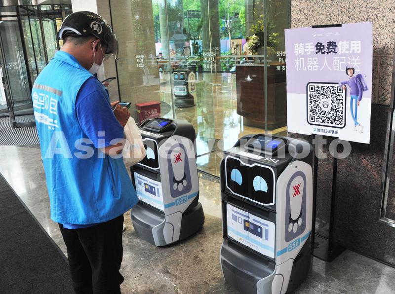 图片说明:2021年8月23日,上海的一幢商务楼内,外卖员准备将餐品袋放入送餐机器人箱内。