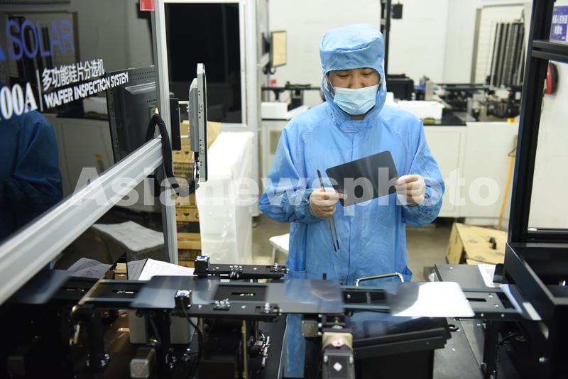 2021年8月25日,江苏省连云港市东海县晶海洋公司员工在车间生产出口订单多功能光伏晶硅片。