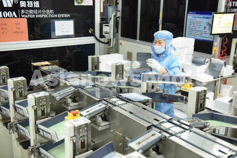 2021年8月25日,江苏省连云港市东海县晶海洋公司员工在车间生产出口订单多功能光伏晶硅片。