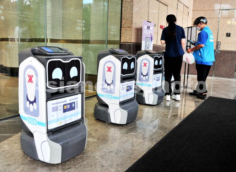 图片说明:2021年8月23日,上海的一幢商务楼内,外卖员准备将餐品袋放入送餐机器人箱内。