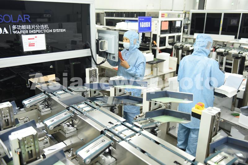 2021年8月25日,江苏省连云港市东海县晶海洋公司员工在车间生产出口订单多功能光伏晶硅片。