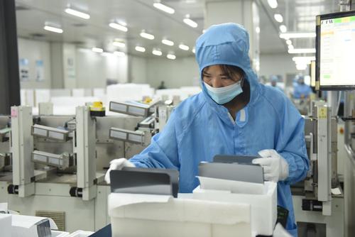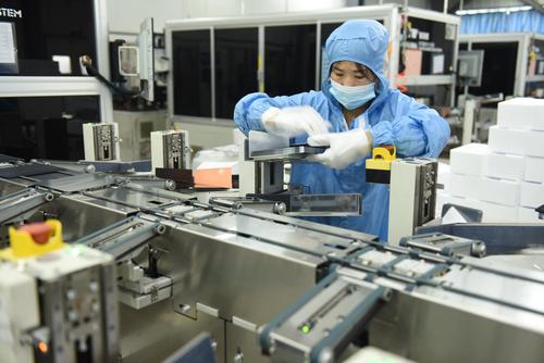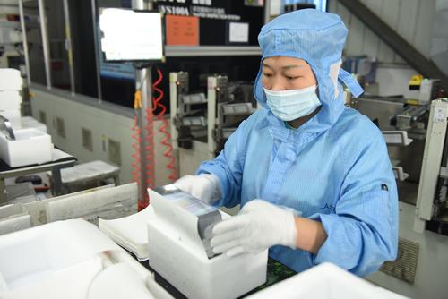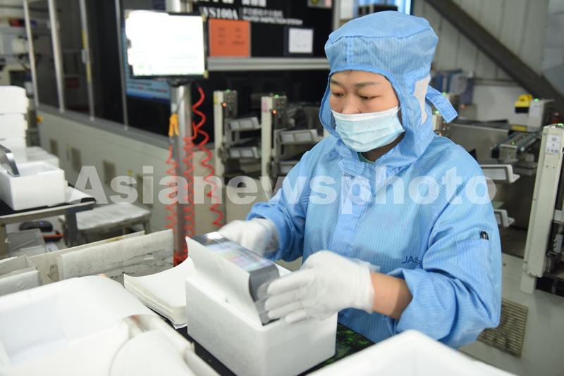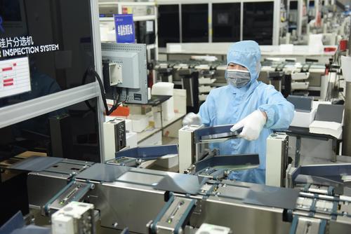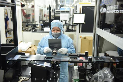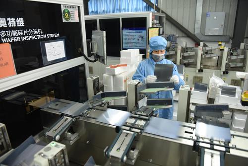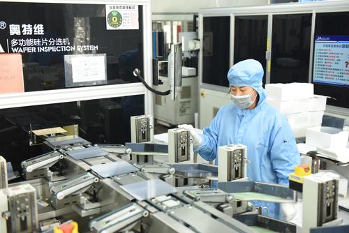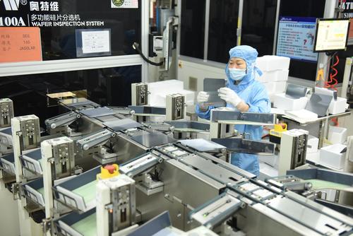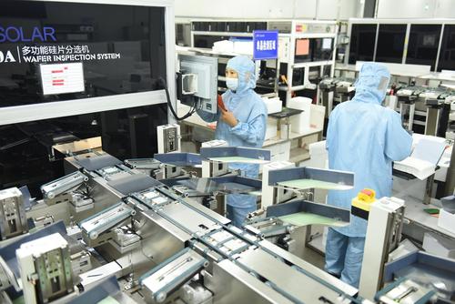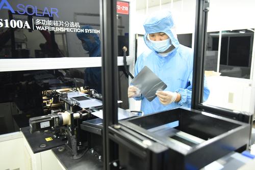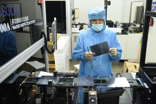 2021年8月25日,江苏省连云港市东海县晶海洋公司员工在车间生产出口订单多功能光伏晶硅片。