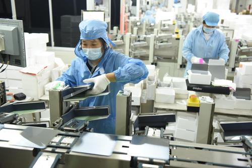 2021年8月25日,江苏省连云港市东海县晶海洋公司员工在车间流水线上生产多功能光伏晶硅片。