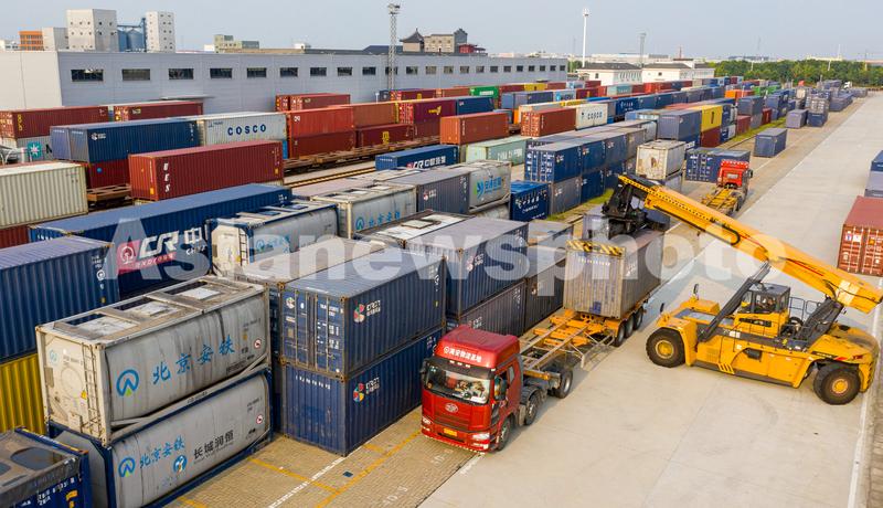 2021年8月26日,中国铁路上海局集团有限公司海安铁路物流基地内,大型起重设备正在往火车上吊装集装箱。这些满装着柴油机和机械配件的集装箱将通过中欧班列(海安—东盟)发往越南安员。