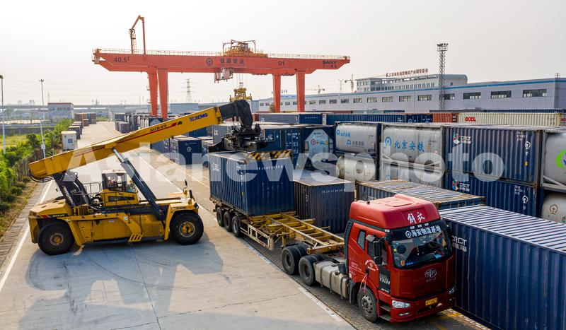 2021年8月26日,中国铁路上海局集团有限公司海安铁路物流基地内,大型起重设备正在往火车上吊装集装箱。这些满装着柴油机和机械配件的集装箱将通过中欧班列(海安—东盟)发往越南安员。