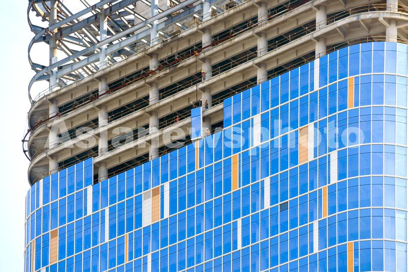 图片说明:工人们正在200米的高空安装玻璃幕墙