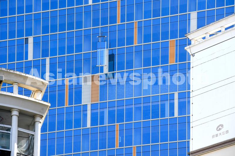 图片说明:工人们正在200米的高空安装玻璃幕墙