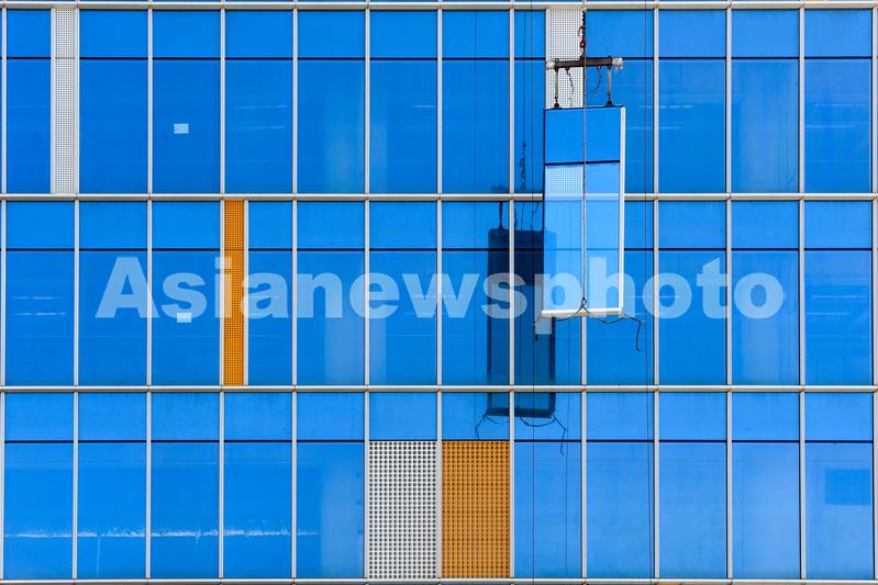 图片说明:工人们正在200米的高空安装玻璃幕墙