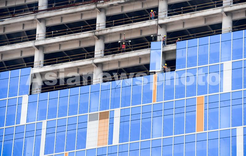 图片说明:工人们正在200米的高空安装玻璃幕墙