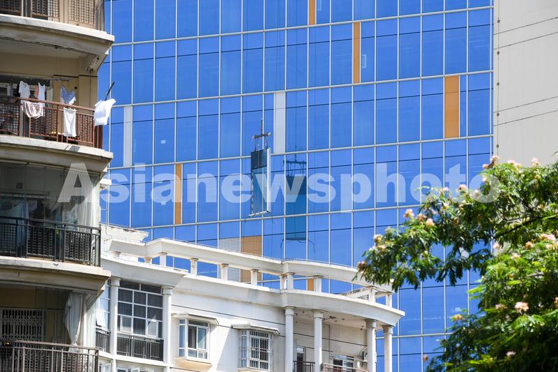 图片说明:工人们正在200米的高空安装玻璃幕墙