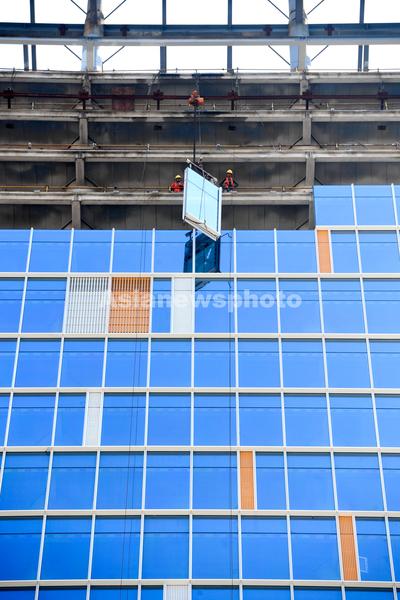 图片说明:工人们正在200米的高空安装玻璃幕墙