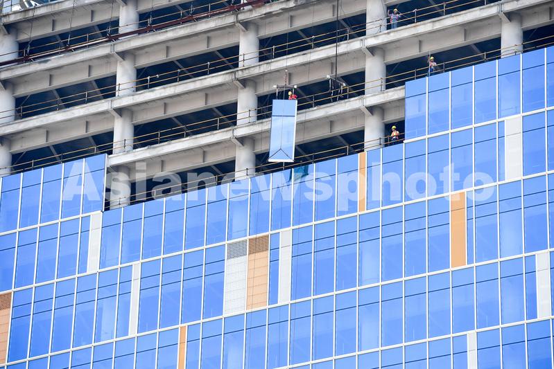 图片说明:工人们正在200米的高空安装玻璃幕墙