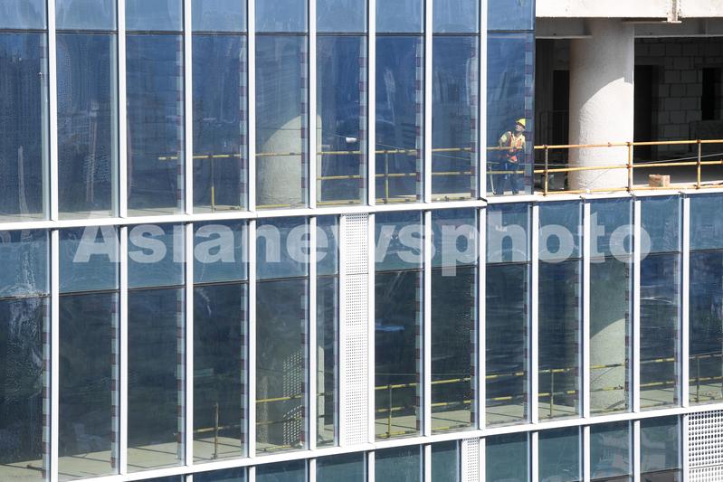 图片说明:工人们正在200米的高空安装玻璃幕墙