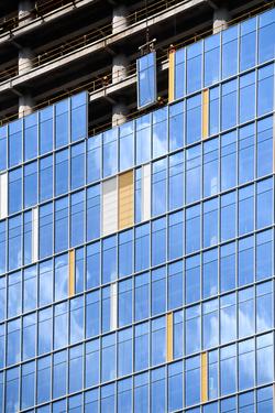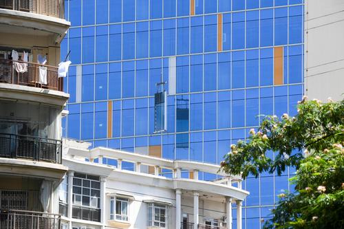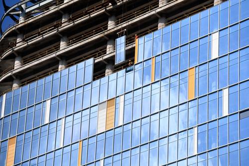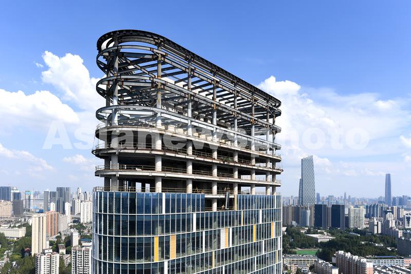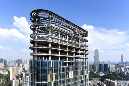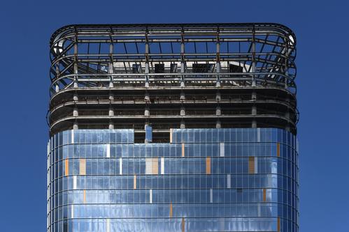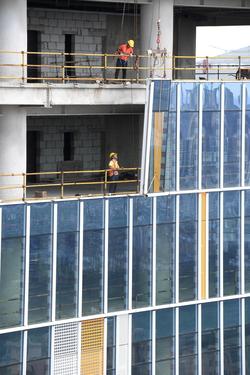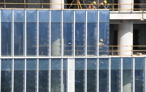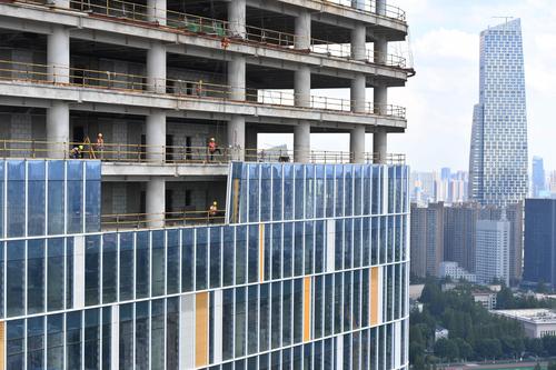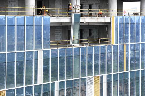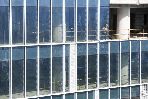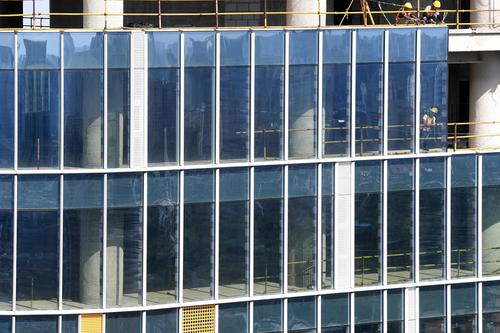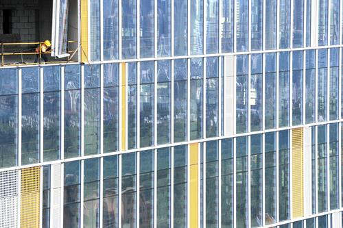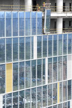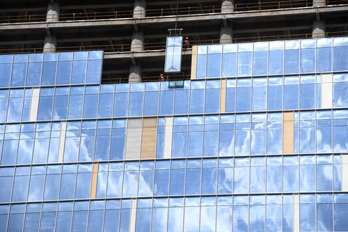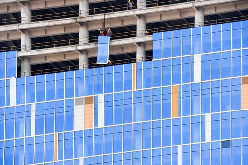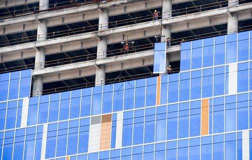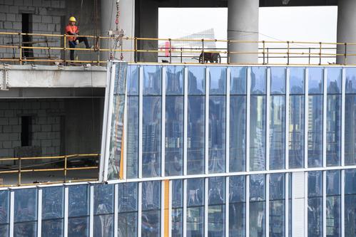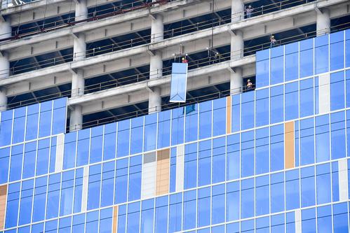 图片说明:工人们正在200米的高空安装玻璃幕墙