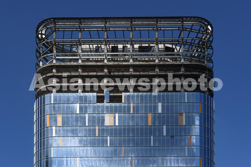 图片说明:工人们正在200米的高空安装玻璃幕墙